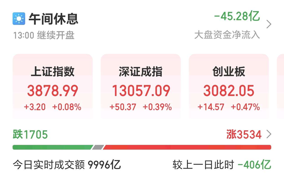 A股三大指数早盘集体上涨,截至午盘,上证指数涨0。08%,深成指涨0。39%,创业板指涨0。47%,北证50涨涨0。47%。沪深京三市半日成交额9996亿元,较上日缩量406亿元。全市场超3500只个股上涨。